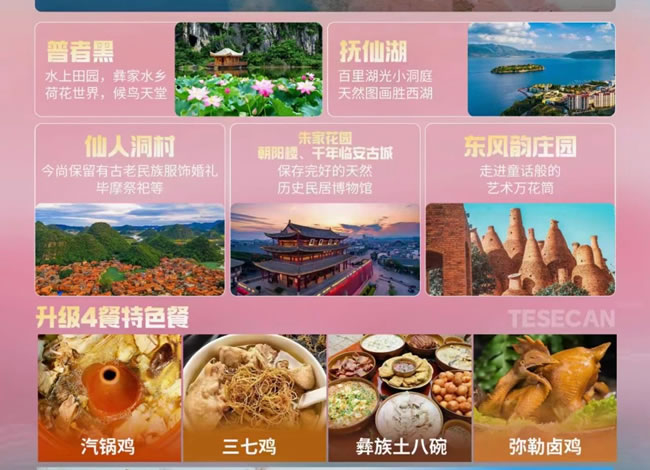 特色餐:三七雞,彝族特色餐,彌勒鹵雞,汽鍋雞,若客人自愿取消行程中所含正餐,視為自愿放棄,不退費!客人因特殊情況(如身體不舒服)不參加團,餐退一半。