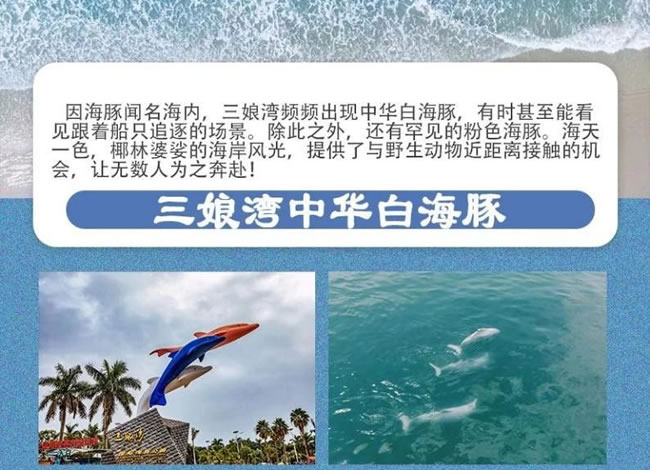 因海豚聞名海內(nèi),三娘灣頻頻出現(xiàn)中華白海豚,有時(shí)甚至能看見跟著船只追逐的 場景。除此之外,還有罕見的粉色海豚。海天椰林婆娑的海岸風(fēng)光,提供了與野 生動物近距離接觸的機(jī) ·備讓無數(shù)人為之奔赴!